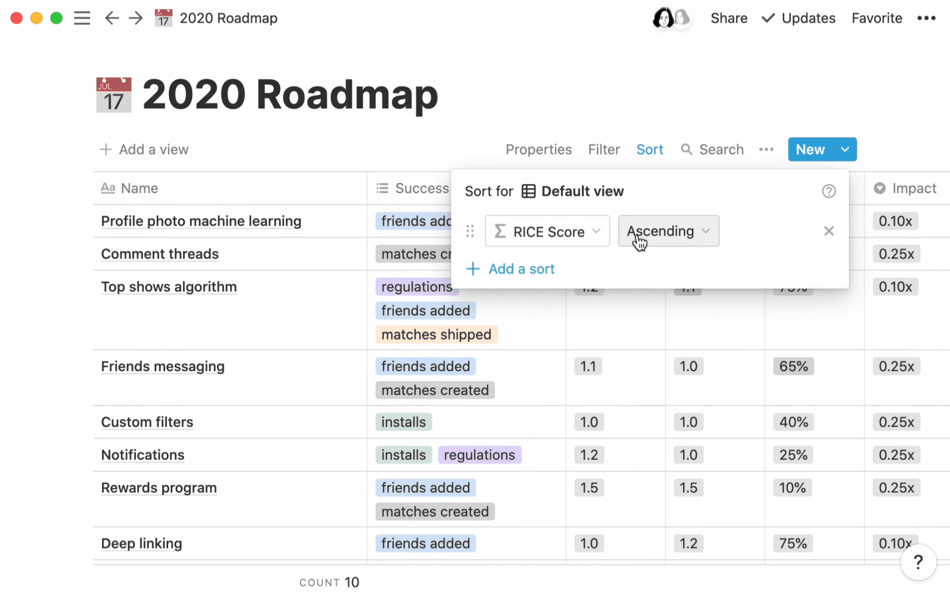 There’s no shortage of good ideas at +1 Labs, which makes it difficult to decide where to invest and which new products to build. With Notion, the team quickly built a roadmap of their big bets for the year. On top of being able to easily document and track these bets, they used Notion’s formula feature to automatically filter each idea through a RICE scoring system. This system drives clarity around what the team wants to run after and when, which helps maintain vision and focus.